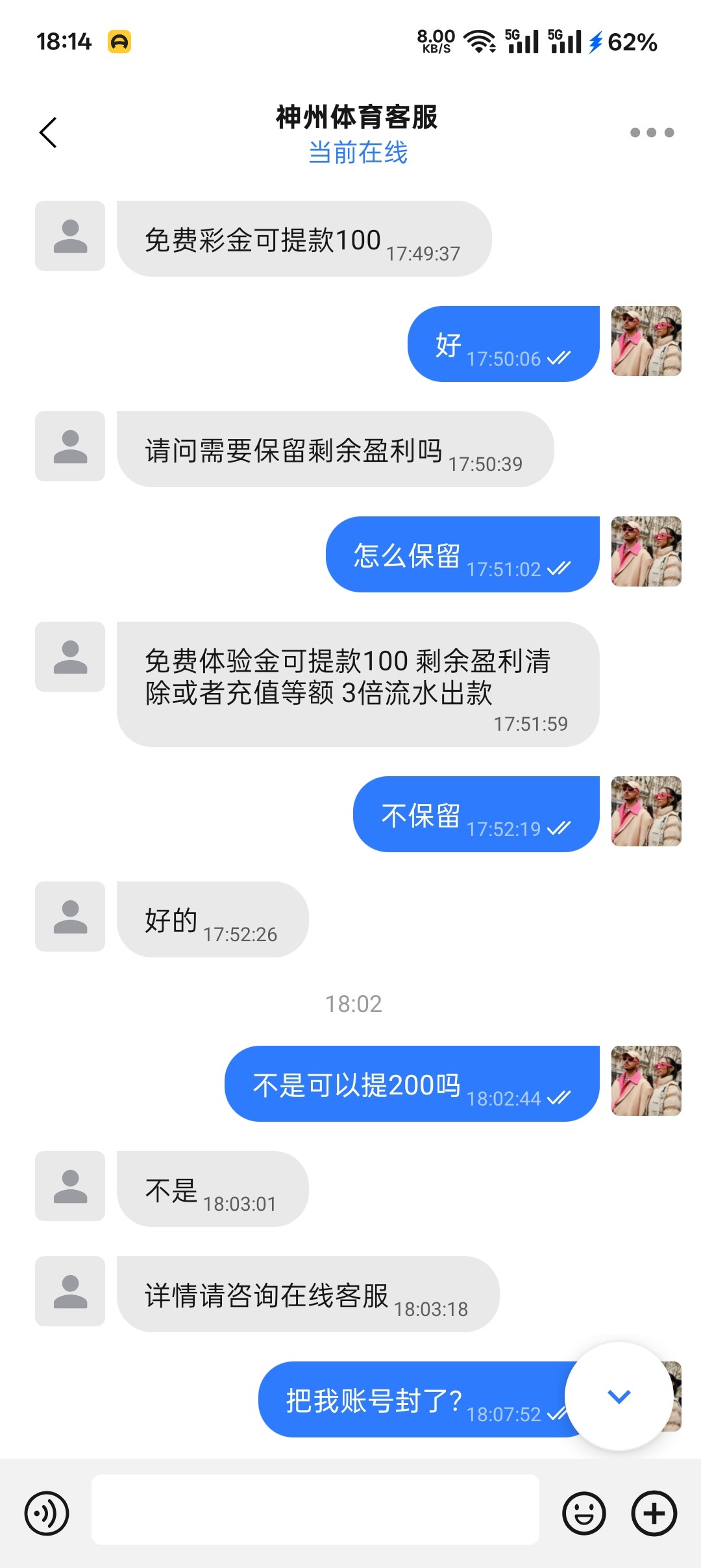 100也没出,我说我不充同等金额,马上封号
