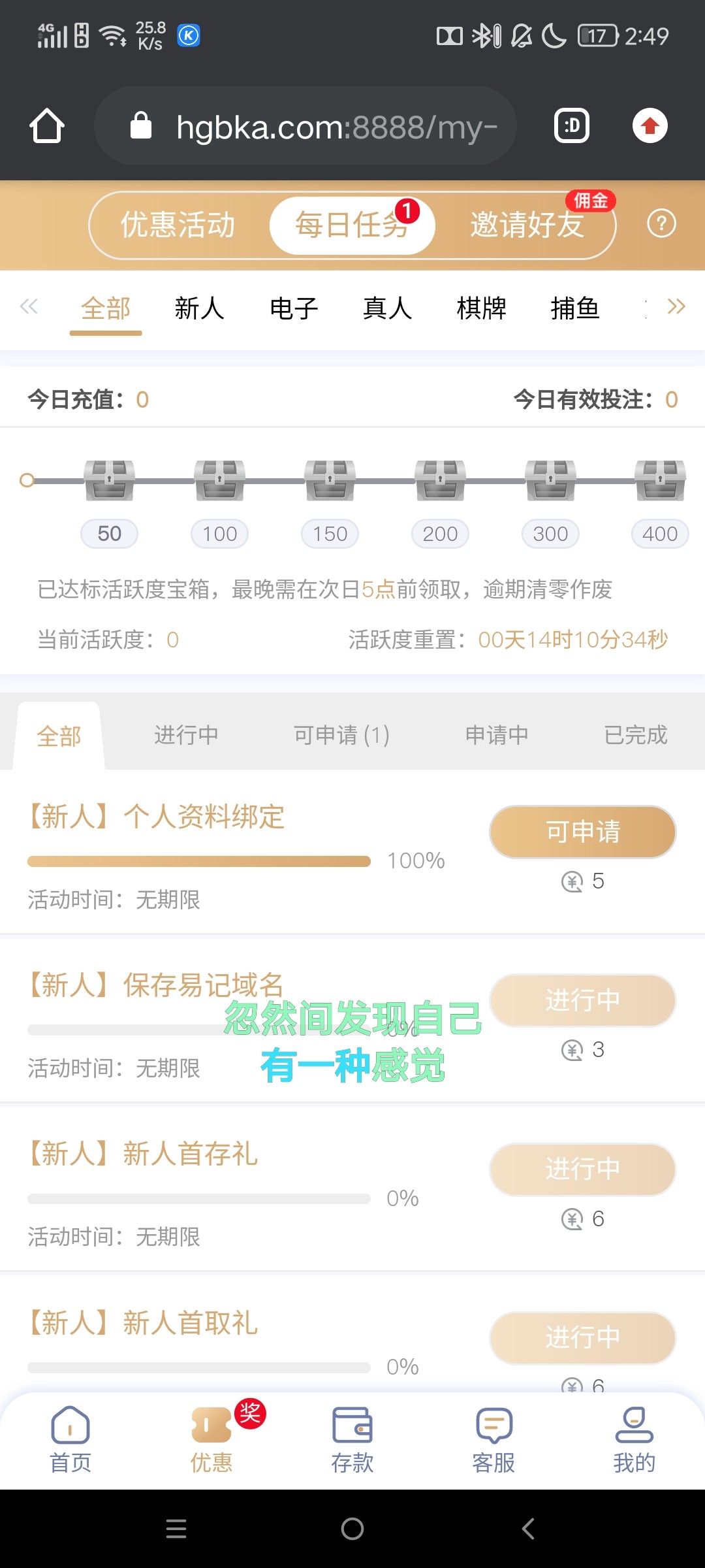 直接手机号注册绑定银行卡,点击我的任务里面自助领取5,还有点击首页的永久域名保存还能送3一共8/100提款