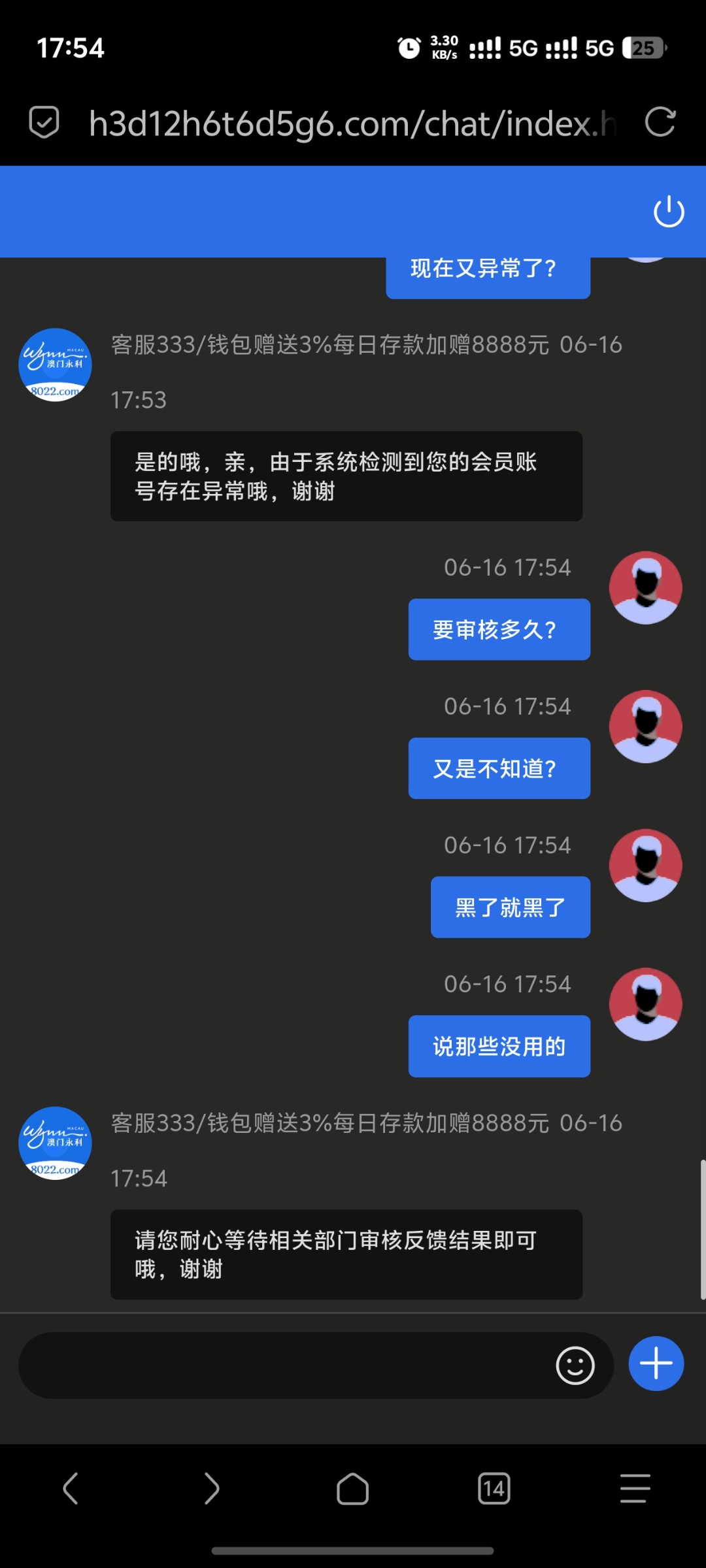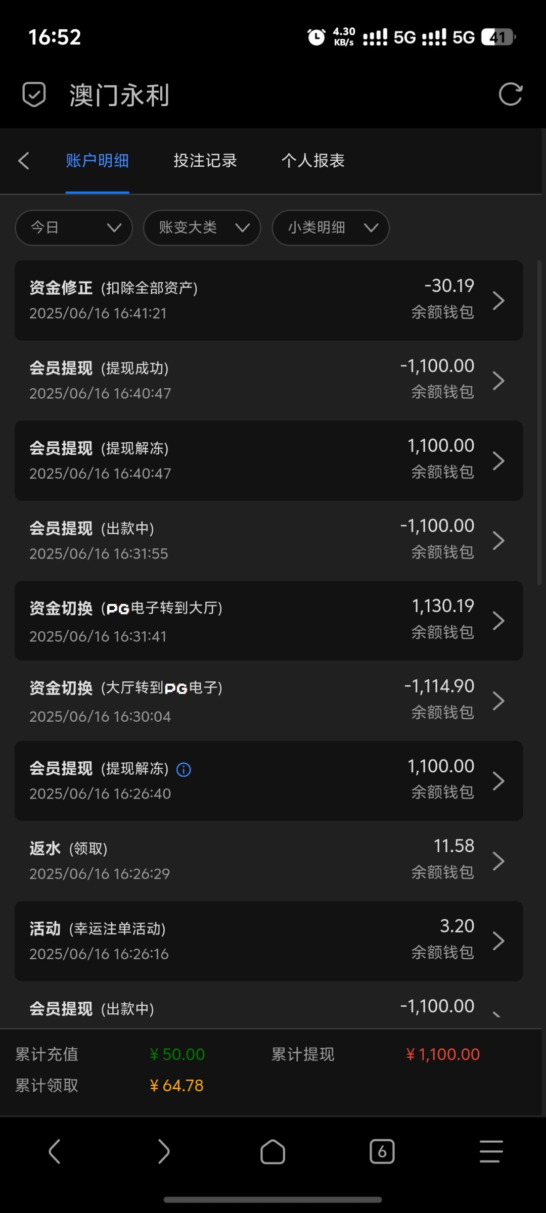 yjc147369 50+50打上1300也打了1500百多流水提现给我退回来直接扣除盈利,剩下50本金怎么搞的?也没有多IP第一次玩的说我注单异常从第一下开始就是打的赏金女王